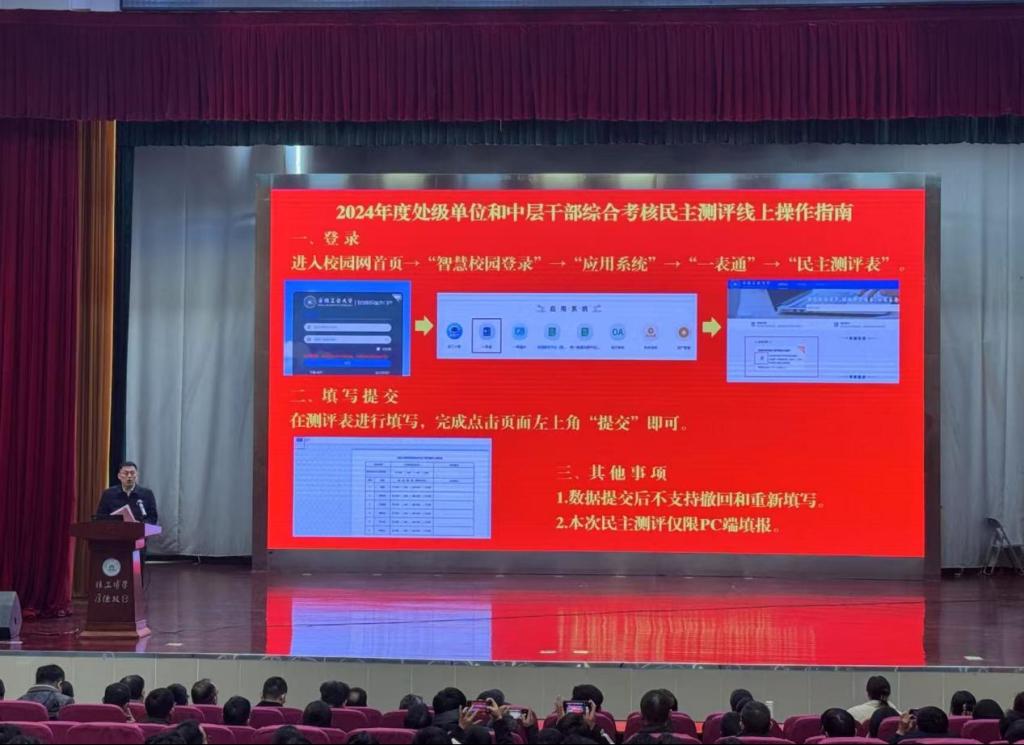 杨建布置了处级单位和中层干部综合考核线上民主测评事宜。他详细说明了测评的时间、方式和要求,提醒教师们要认真对待,客观公正地进行评价,以确保考核工作的顺利进行。