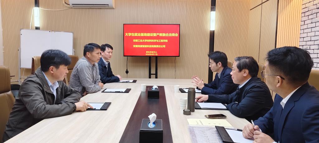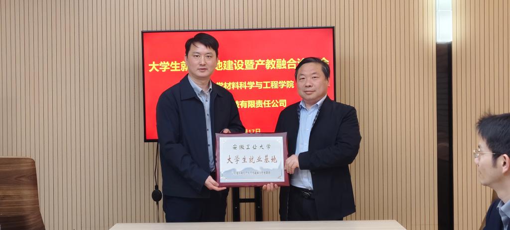 平台、人才培养及毕业生升学就业等方面系统介绍了学校及学院的整体情况,重点阐述了学院与安徽高量在产业合作与人才培育上的契合点。双方现场签订了人才培养与就业基地建设合作协议书,并向企业颁授了“安徽工业大学大学生就业基地”铜牌。