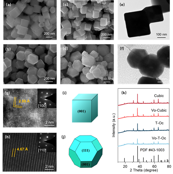 材料的原子排布各向异性导致材料的电导率、极化率、电学性质等各向异性,使得不同暴露晶面的原子结构、能级结构和表面能等存在差异。这些差异对于催化剂活性位点的电子结构和本征催化活性有着重要的影响。目前,研究发现尖晶石Co3O4的OER活性对其暴露晶面具有依赖性。除了原子排布之外,氧空位的引入可有效改善Co3O4的电子结构和OER活性。因此,探究在Co3O4不同晶面上引入氧空位对其OER活性及催化机理的影响,对开发高性能钴基电催化剂具有重要意义。