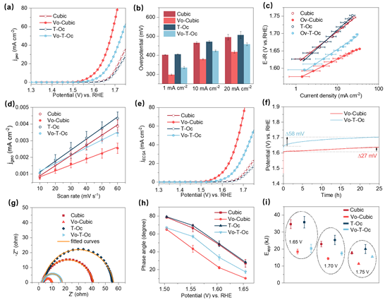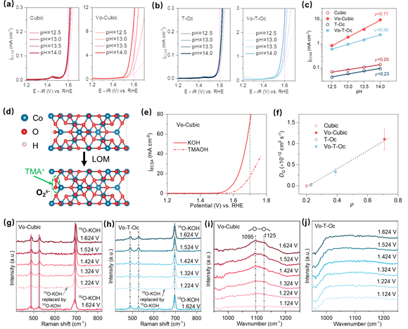 本研究首先合成了暴露(001)面的立方体Co3O4,以及主要暴露面为(111)的截断八面体Co3O4,并在其表面引入氧空位。研究结果发现,产生氧空位后,Co3O4(001)面具有优异的OER活性,其起始过电位为298 mV,明显优于暴露(111)面的Co3O4(335 mV)。系统的电化学表征、化学探针、原位光谱耦合同位素实验以及理论计算结果表明,因氧缺陷的引入,Co3O4的(001)晶面由吸附演化机理(AEM)转变为晶格氧氧化机理(LOM),突破了线性标度关系的限制,具有更高的OER活性,而(111)晶面仍遵循AEM机理。该研究成果为通过在特定晶面引入缺陷提高催化剂电解水制氢效率提供了新的研究思路。