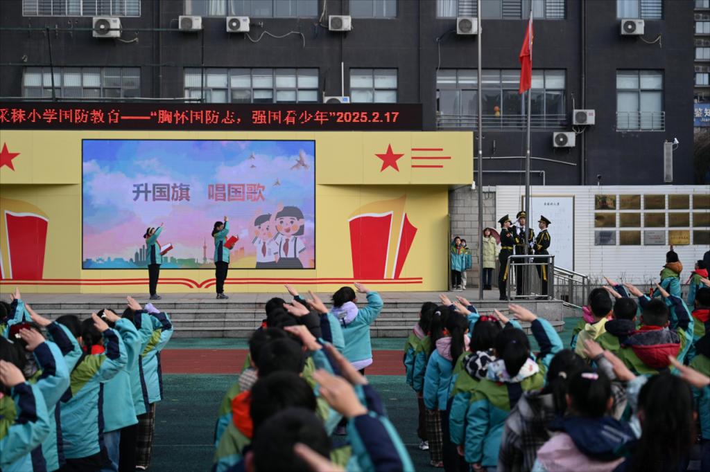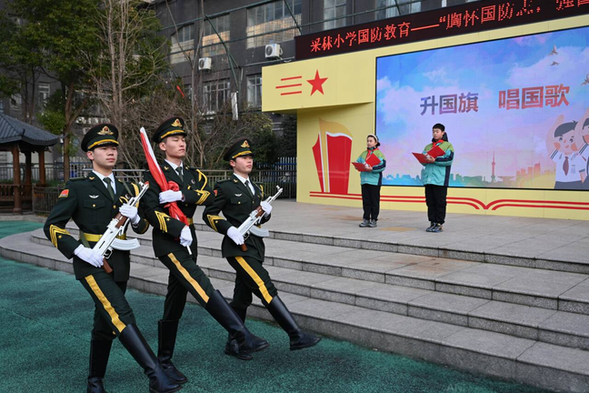 当日,学院还邀请了校国旗护卫队成员参与了采秣小学开学第一课的升旗仪式活动。护旗手和升旗手们手握鲜艳的五星红旗,目光坚定、神情肃穆。他们迈着整齐有力的步伐,走向升旗台。在庄严的国歌声中,国旗护卫队成员以饱满的精神状态和规范的动作,完成了升旗任务。这一刻,他们用行动诠释了对国旗的尊重和对国家的热爱,为整个活动注入了浓厚的国防教育氛围。