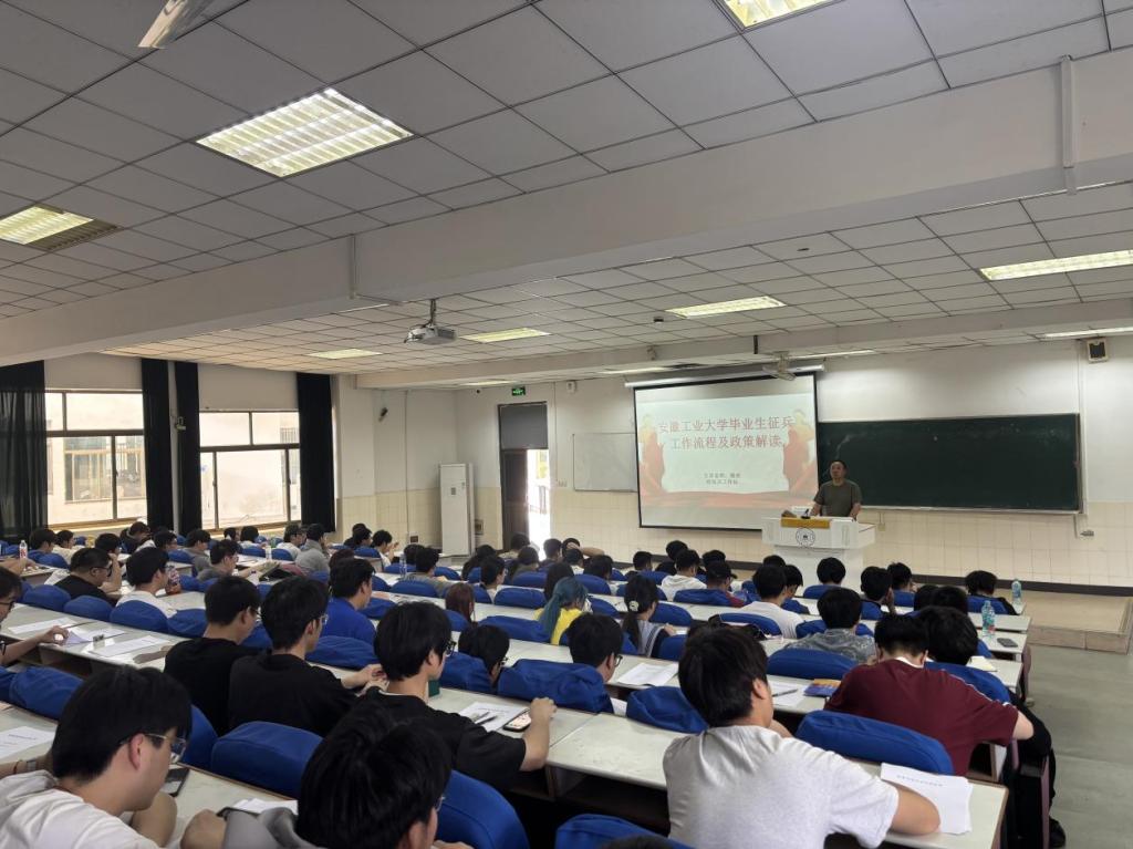 在阶教102召开2025届毕业生就业工作推进会暨安全教育年级会。校征兵工作站嵇虎、秦才婕老师受邀为同学们开展国家安全教育及大学生征兵入伍工作专题宣讲,会议由毕业班辅导员王心雨、赵美男主持。