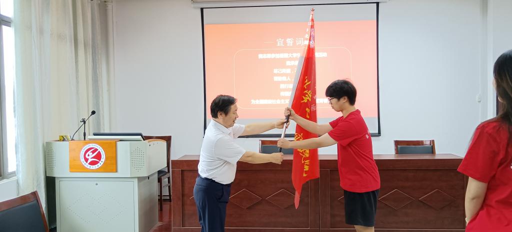 汪盛颜在动员讲话中从历史征程、精神传承和实践内涵多个视角,深刻阐述了大学生暑期社会实践活动对青年学生成长成才的重大意义。他勉励全体参与实践团队的同学,要在学习、思考、实践与领悟的循环中,筑牢理想信念之基,把牢青春前行的方向;在锐意进取的征程里,滋养青春理想的幼苗,彰显青春应有的作为;在躬身实践的舞台上,绽放青春独有的风采,勇担人生赋予的使命。并结合往年案例对活动安全进行了重点强调,要求各团队务必牢固树立“安全第一”的理念,将安全意识内化于心、外化于行。他还为社会实践团队授旗。