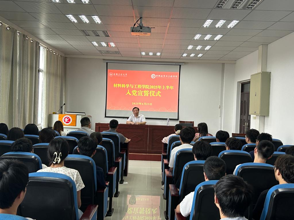 在材料南楼516会议室举行2025年上半年入党宣誓仪式。学院党委副书记、纪委书记、副院长汪盛颜出席仪式并讲话,各学生党支部书记列席,42名新发展党员和42名转正党员参加宣誓。