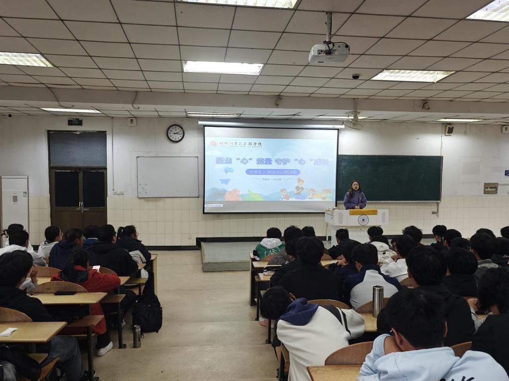 随后,王心雨结合新生刚入校园的实际情况,将入学适应与心理发展有机结合开展大学生心理健康教育专题讲座。她结合丰富案例,为同学们系统讲解了大学阶段常见的心理适应问题,深入剖析了学习方式转变带来的自我管理挑战、生活环境变化引发的情绪波动,以及人际关系建立中的沟通技巧等方面的发展性困扰。她强调“主动求助是勇敢的表现”,鼓励同学们要以积极心态面对成长挑战,积极寻求老师及校内资源帮助,顺利度过适应期。